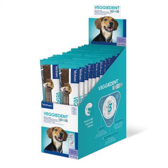 Veggiedent FRESH M закуски для гигиены полости рта собак среднего размера (от 10 кг до 30 кг). Эти полоски помогут вашей собаке сохранить свое дыхание свежим и здоровым. Veggiedent FRESH M в приводе .