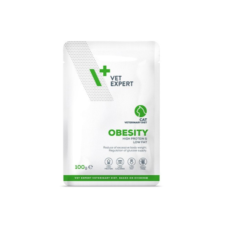 Диетический корм для кошек, снижающий избыточный вес и способствующий его контролю. Полнорационный и сбалансированный диетический корм для взрослых кошек, предназначенный для снижения избыточного веса и поддержания оптимального веса. Диетический корм для кошек с ожирением (Obesity Cat) – это высокобелковый, низкокалорийный, низкожирный корм с повышенным содержанием клетчатки, способствующий безопасному снижению избыточного веса при сохранении мышечной массы. Низкокалорийный, низкожирный рацион: обеспечивает безопасное снижение избыточного веса при сохранении мышечной массы. Высокобелковый рацион с низким содержанием углеводов: обеспечивает хороший гликемический контроль у кошек с диабетом. Рацион с повышенным содержанием клетчатки: способствует снижению избыточного веса, стимулирует моторику желудочно-кишечного тракта. Беззерновой и безглютеновый рацион: минимизирует риск непереносимости глютена и побочных реакций на злаки (пшеницу, овес). Ранее этот продукт выпускался в жестяных банках, но теперь их заменили более удобными пакетиками. Упаковка: 100 г