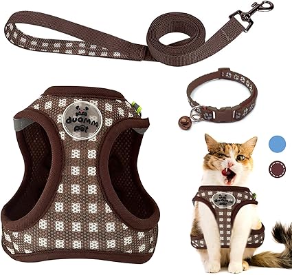 VINEST Шлейка для кошек с поводком, защита от побега для 2,5-5,5 кг, 150 см, Светоотражающий поводок для кошек с поводком для кошек, щенков, Шлейка для кошек из мягкой сетки, защита от побега с кошачьим ошейником (коричневый, S)
