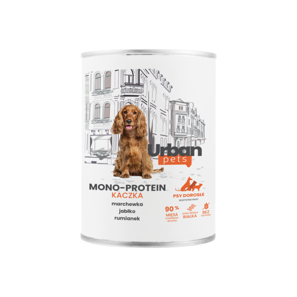 Влажный корм для собак Urban Pets Mono Protein DUCK. 90% мяса, субпродукты и бульон. Один источник белка. Рекомендуется для животных с пищевой непереносимостью. Не содержит глютен и злаки, которые могут вызывать аллергию. Мясо утки содержит много полезных жирных кислот, селена, цинка, фосфора, железа и витаминов группы B. Оно также характеризуется высоким содержанием белка и ненасыщенных жирных кислот. Упаковка: банка 400 г, банка 800 г.