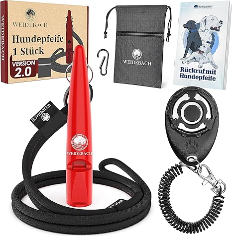БОНУСНАЯ ЭЛЕКТРОННАЯ КНИГА ОБЪЯСНЯЕТ КОМАНДЫ ПОДЗЫВА: Ваша собака бежит по ходу движения или хочет поймать мышь? С собачьим свистком Weidebach это конец. Дайте ей безошибочно понять, что нужно немедленно вернуться к вам с помощью собачьего свистка Постоянная частота: одна и та же частота гарантирует, что ваш четвероногий друг всегда будет слушать ваш сигнал. Неважно, свистите ли вы или член семьи. Собачий свисток всегда имеет четкий, постоянный тон. Включает регулируемый плечевой ремень и полезную сумку для лакомств: возьмите с собой лакомства и собачий свисток, когда выгуливаете собаку, в стильной сумке от Weidebach. Так что каждая поездка станет веселым опытом! СЛЫШНО НА БОЛЬШИХ РАССТОЯНИЯХ ДЛЯ СОБАКИ: Ваша собака убежала от них? Только собачий свисток Weidebach поможет. С его помощью вы можете надежно позвать свою собаку обратно на большие расстояния. Он даже надежно заглушает помехи. Революционные решения в обучении собак: собачьи свистки помогают вам немедленно выполнять команды подзыва. Поскольку звук всегда остается одинаковым, собака слышит его одинаково хорошо, независимо от того, насколько авторитарным и решительным вы себя ведете.