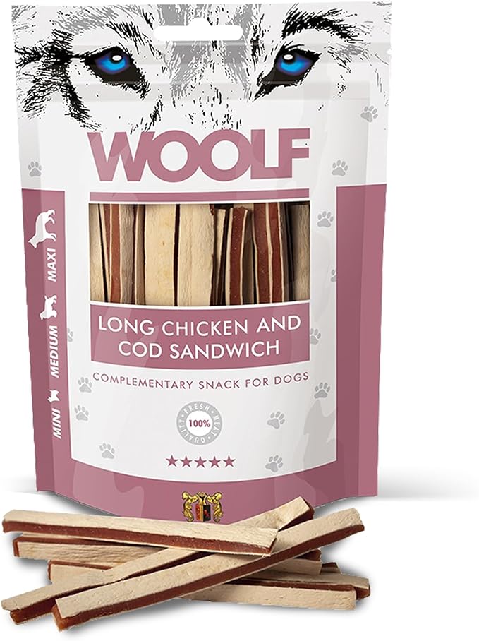 Лакомства для собак 100 г. Сэндвич-полоски с курицей и треской. Возрастная группа: щенки. Высокое качество. Бренд: WOOLF. › Подробнее о товаре