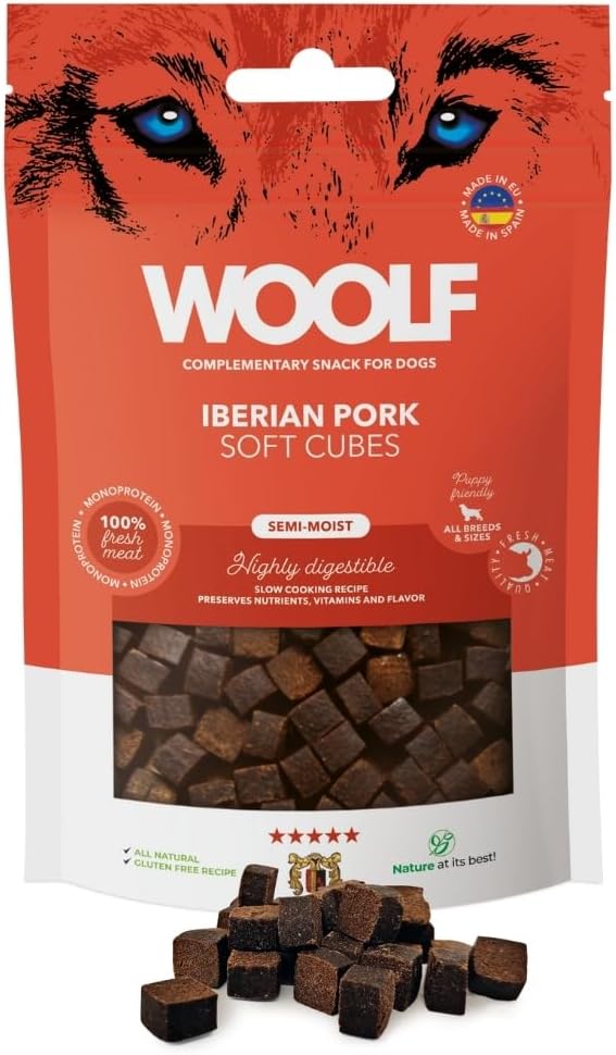 WOOLF Soft Cubes — Snack complementari per cani, snack semi-umidi e senza glutine con ingredienti naturali, formula mono proteica, adatto per cani e cuccioli (maiale iberico, 100 g)