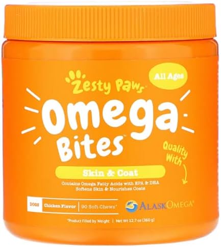 Zesty Paws Omega Bites для собак, для кожи и шерсти, для всех возрастов, куриный вкус, 90 мягких жевательных таблеток. Упаковка может отличаться. Смягчает кожу и питает шерсть. Подходит для собак всех возрастов. Содержит омега-жирные кислоты, включая ЭПК и ДГК. Изготовлено из натуральных ингредиентов, качество AlaskOmega. Мягкая кожа и блестящая шерсть = счастливая собака! › Подробнее о товаре